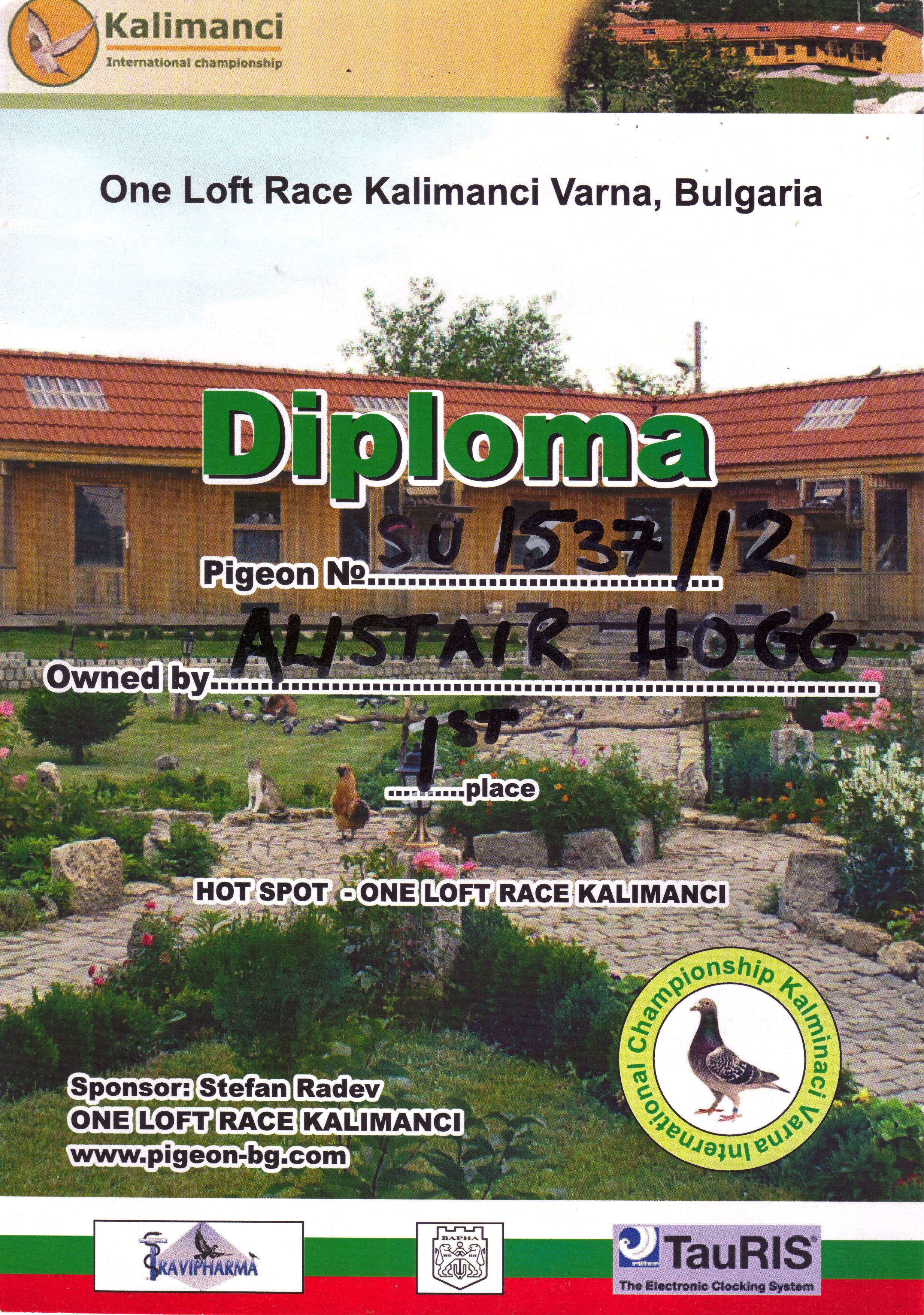 1st Prize certificate for being 1st in the Kalimanci Race, Bulgaria.