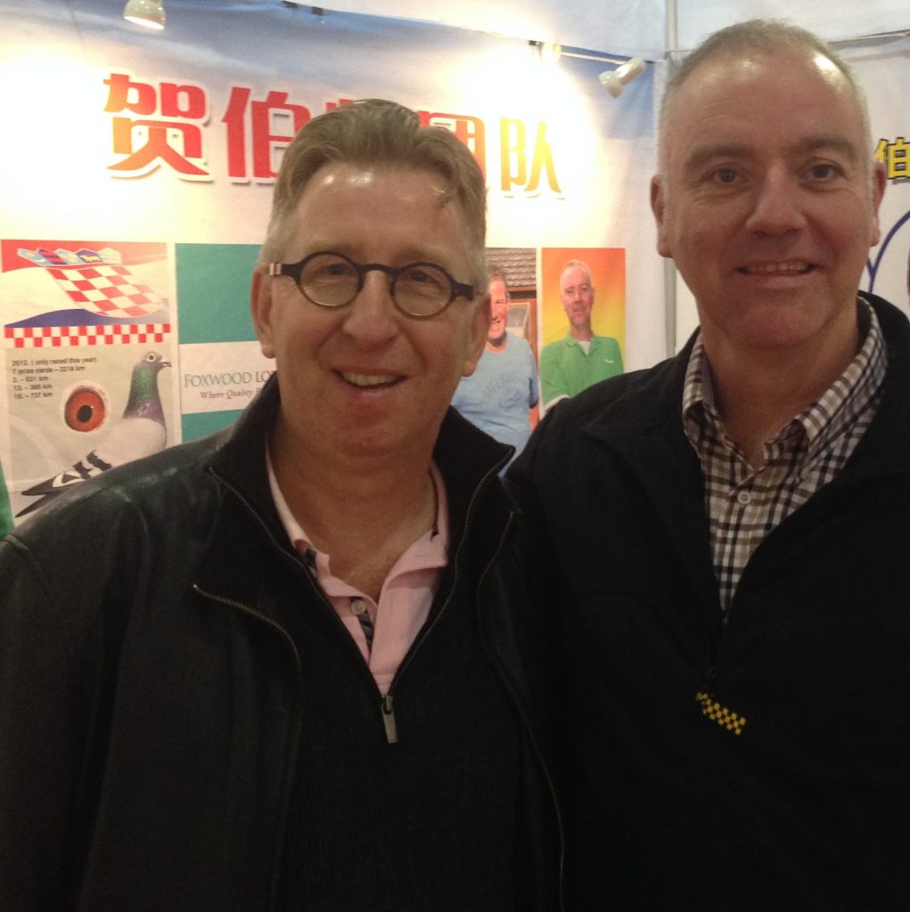 At the biggest pigeon show in China, Lang Fang meeting up with sports friend Gerard Koopman discussing the pigeon sport.