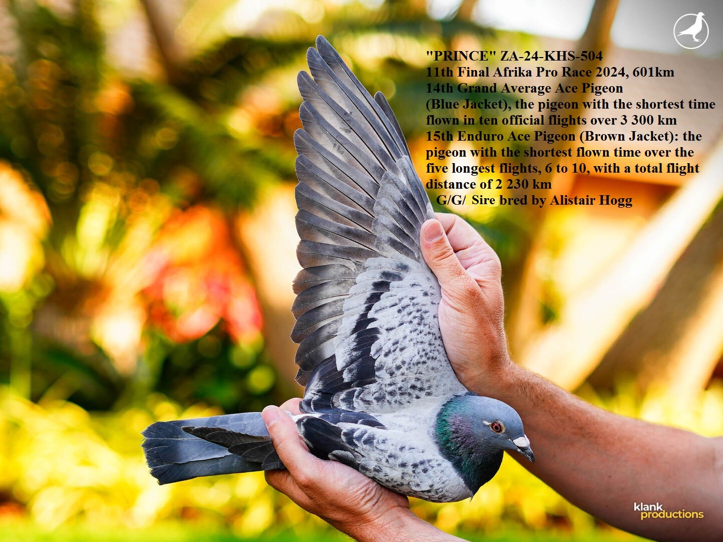 Also 14th Grand Average”ACE” Pigeon (Blue Jacket) for the pigeon with the shortest time Flown in 10 Official flights Total 3300km! 15th Enduro “ACE” pigeon (Brown Jacket) for the pigeon with the shortest time flown over the 5 Longest Flights with a Total flight distance of 2230km! G/G/Sire Bred by Alistair Hogg