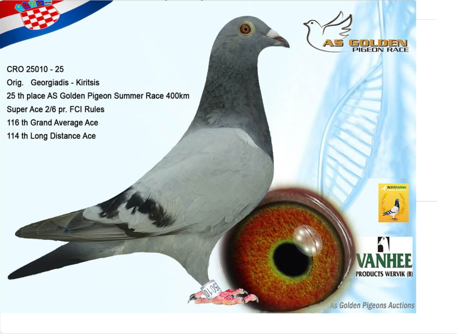 Sire of “25219” 1st against 3990b, also “55089” 86th Final Race Rimini, 501km in Italy also “55501” 29th Final Race Halkidiki Greece 325km with 100km of this distance being over the sea,154th 336km, 86th 224km, 40th ACE Pigeon, brother to this pigeon 2nd H/Spot 2, 16th Semi Final Halkidiki, Greece